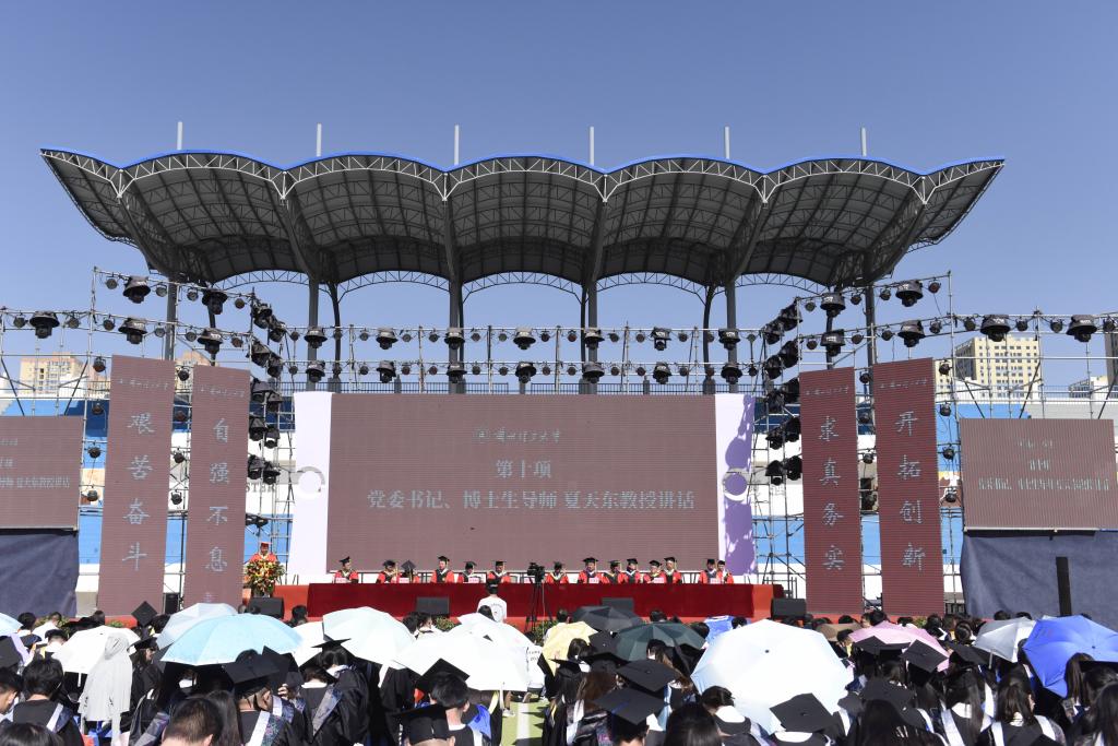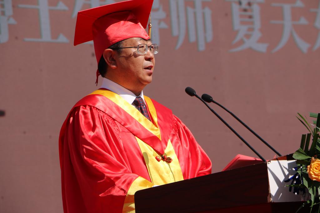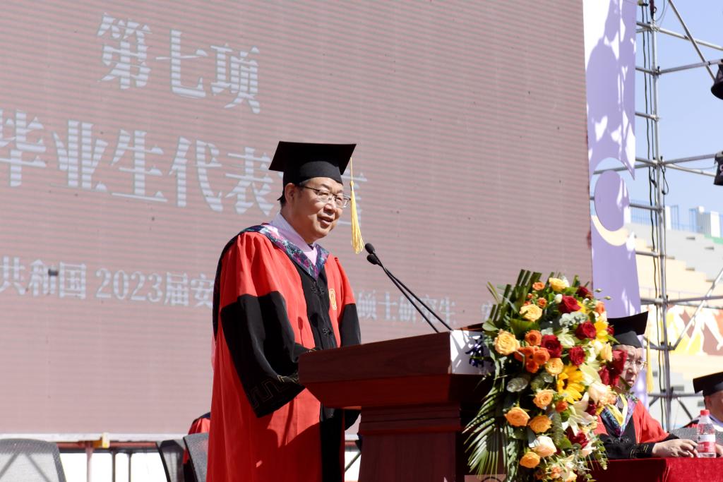 夏天东以“奋进求是启新程 挺膺担当向未来”为题讲话,并代表学校向毕业生表示热烈祝贺。他回顾了同学们与国同行、不负韶华的成长历程,肯定了同学们在三年疫情时期的优异表现,表达了对同学们取得成绩的自豪和对大家学成离校的依依不舍。临别之际,他深情寄语毕业生三点希望:一要坚定信念,争做胸怀国家的“有志”青年。希望同学们积极响应习近平总书记的谆谆教诲,厚植家国情怀,以民族复兴大任为己任,传承百年兰理工红色基因,赓续红色血脉,以青春之我、奋斗之我让个人理想与国家发展同频共振,与人民同心、与国家同向、与时代同行,争做强国有我的担当者。二要脚踏实地,争做勤学善思的“有识”青年。希望同学们始终把学习作为一种精神追求、一种生活爱好、一种工作责任,始终保持对知识的渴求,对智慧的向往,笃怀求知之志,紧跟时代步伐,保持对未知的好奇心,以脚踏实地的韧劲和干劲践初心、显担当,努力成为引领科技前沿、引领行业发展、引领社会风尚的大智之才。三要不负韶华,争做矢志奋斗的“有为”青年。希望同学们遇到挫折时,能够保有“千磨万击还坚劲”的韧性和“敢教日月换新天”的勇气,用奋斗书写精彩的青春华章,以实际行动诠释新时代青年学子的理想与使命、责任与担当。