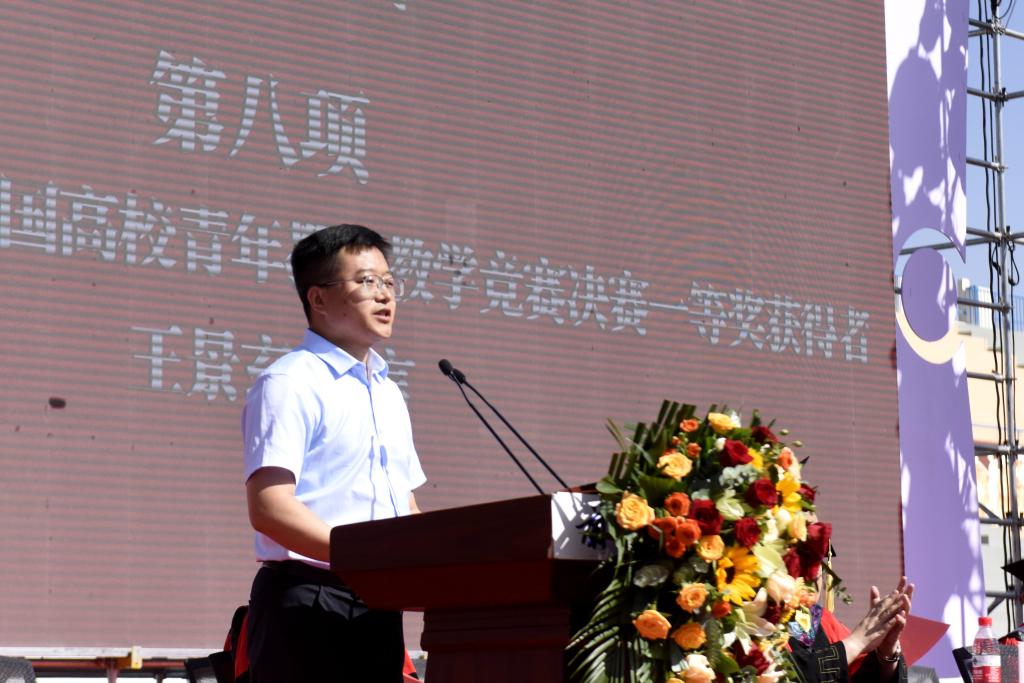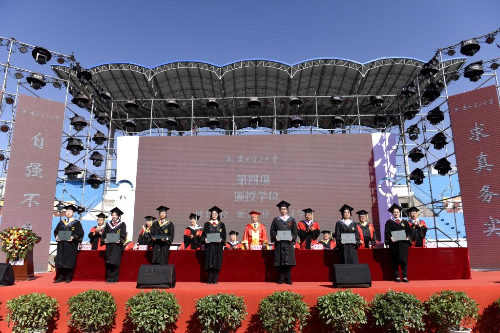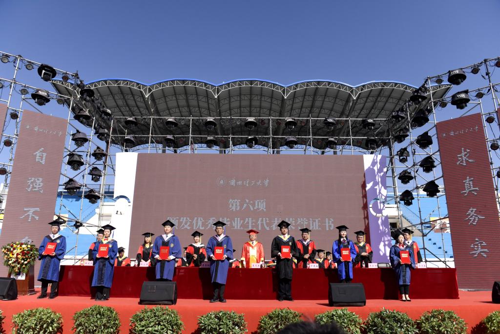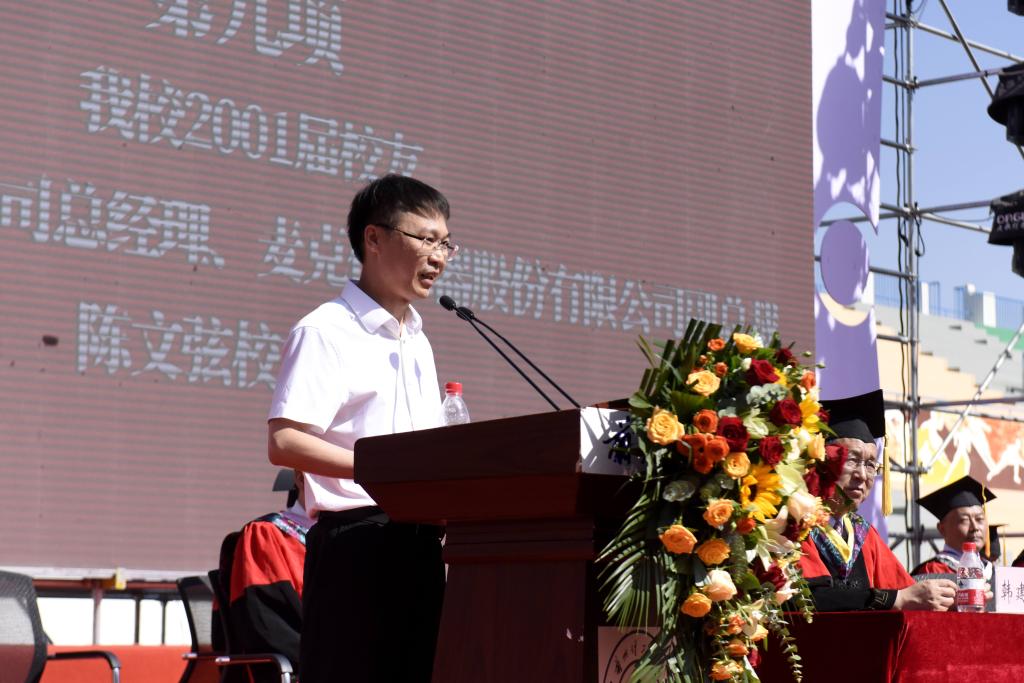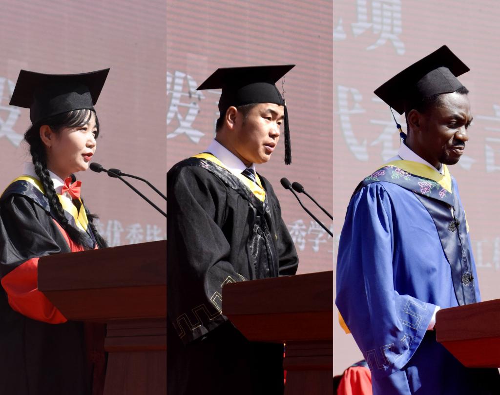 典礼上,博士研究生王洁、本科生陈荣卓和留学生安多作为毕业生代表分别做了发言,他们回忆了自己在学校的点点滴滴,一字一句,都浸透着对母校的无限深情,表达了对母校、对老师的感激与不舍之情和继往开来、追光筑梦、勇担时代使命,造福家国的情怀。青年教师代表王景玄老师,结合自身的成长经历做了交流发言,希望毕业生同学心念母校,做服务社会的奉献者;攻坚克难,做谨言慎行的合作者;追逐梦想、做意气风发的奋进者。陈文弦校友回顾了自己所属公司从困难期、高速发展期和目标规划期的团队创业经历,以生动事例告诫同学们做事要专注,延迟满足,注重团队合作。希望师弟师妹传承“奋进求是”的兰理工精神,终身学习,持续提高自己的认知能力,努力追寻内心的渴望,为社会创造价值,无愧于国家、家人和自己。