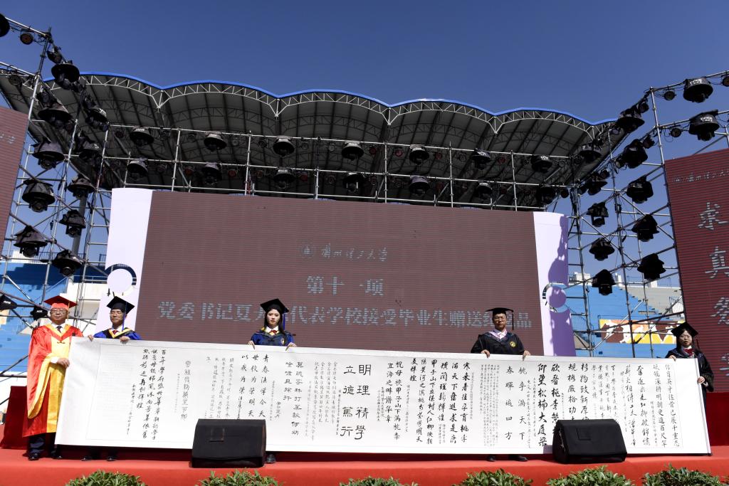 典礼上,夏天东代表学校接受了由2023届全体毕业生精心准备的“毕业生赠言”卷轴,赠言卷轴是同学们对母校的不舍、深情和祝福,承载着深厚的师生情谊和对母校浓浓的爱意。毕业生代表为学校领导、老师、校友献花,以此表达对母校精心培养的感谢,对恩师奉献、呵护、教导的感谢,对校友榜样引领,大力支持的感谢。依依惜别日,浓浓工大情,师生共唱毕业季歌曲,共同高歌《复兴的力量》,毕业典礼暨学位授予仪式在热烈的气氛中圆满落下帷幕,祝福全体毕业生筑梦前行,前程似锦,在强国建设民族复兴新征程上唱响绚烂的青春之歌!